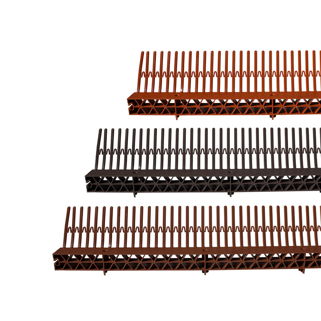 Odkvapová vetracia mriežka s hrebeňom S má radu cenných vlastností a je vyrobená z polypropylénu. Tri univerzálne farby sú vám k dispozícii. Mriežka proti vrabcom s vetracím hrebeňom bráni preniknutiu hlodavcov, hmyzu a najmä vrabcov pod povrch strechy. Plní aj odvetrávaciu funkciu. V online obchode Decket nájdete mriežky proti vrabcom aj v iných veľkostiach a bez mriežky.